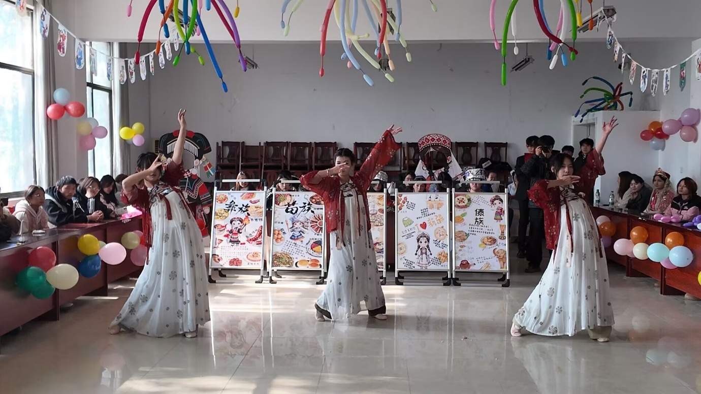 活动中,精彩纷呈的民族文艺表演陆续登场。护理学院学生陈雅带来的古典舞蹈《丽人行》,舞姿轻盈、仪态优雅,展现了中华传统舞蹈的深厚底蕴;学生阿依古再表演的维吾尔族舞蹈《石榴花开》,以欢快的节奏、绚丽的服饰,呈现出浓郁的民族风情。最后的互动环节,师生手牵手围成同心圆,伴随音乐共同起舞,现场气氛热烈融洽,团结友爱之情洋溢其中。