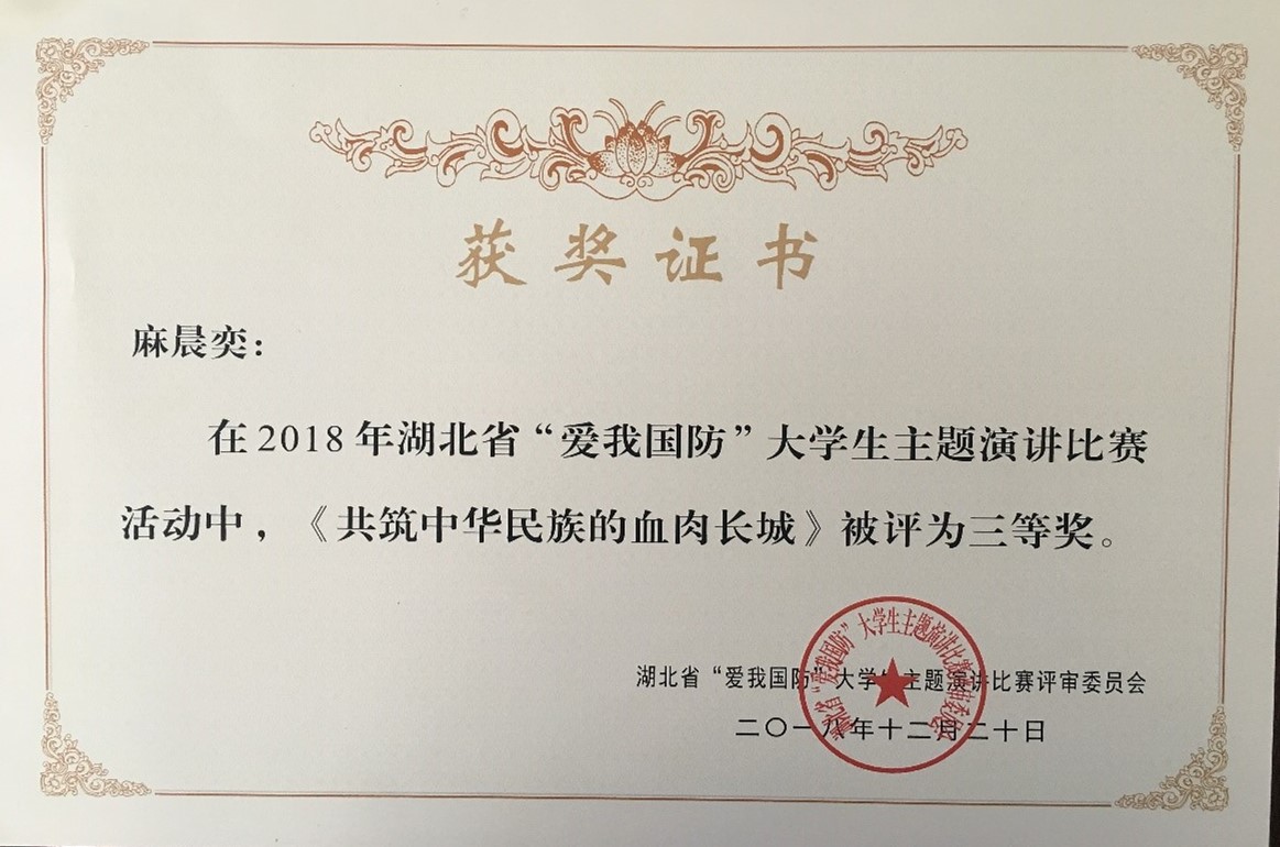 近日,湖北省“爱我国防”大学生主题演讲比赛评审委员会公布评审结果,Beat365官网推荐的医护学院麻晨奕同学荣获三等奖。