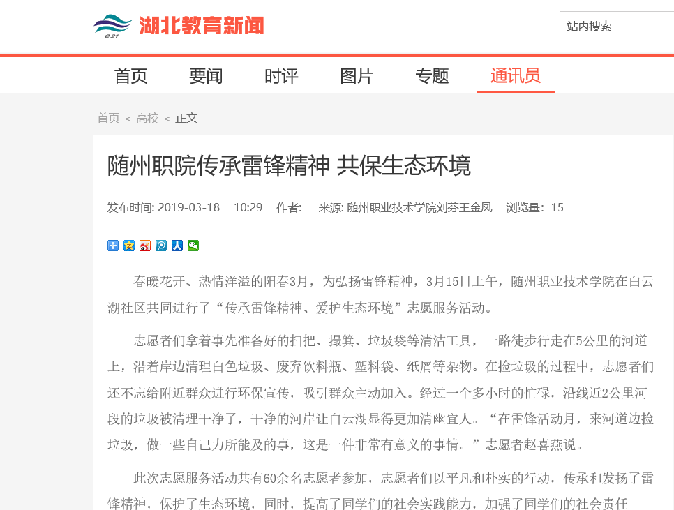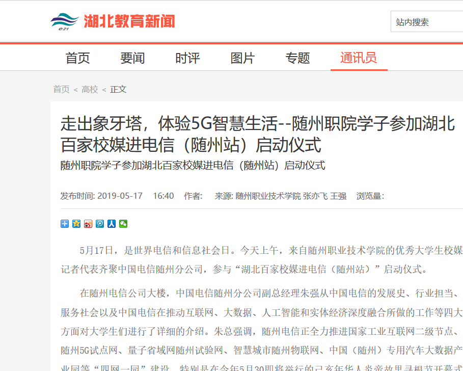 在建设“特色随职”,助力“品质随州”发展,奋力打造“全国知名全省一流职业技术学校”的路上,各项工作捷报频传,各级媒体聚焦特色随职的发展,特色随职得到了社会的广泛关注。2019年上半年,省级主流媒体43次聚焦随州职院,打造了学校的社会形象,进一步提升了学校的社会美誉度和社会影响力。