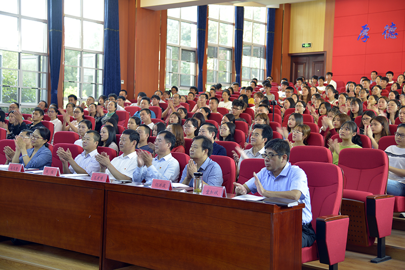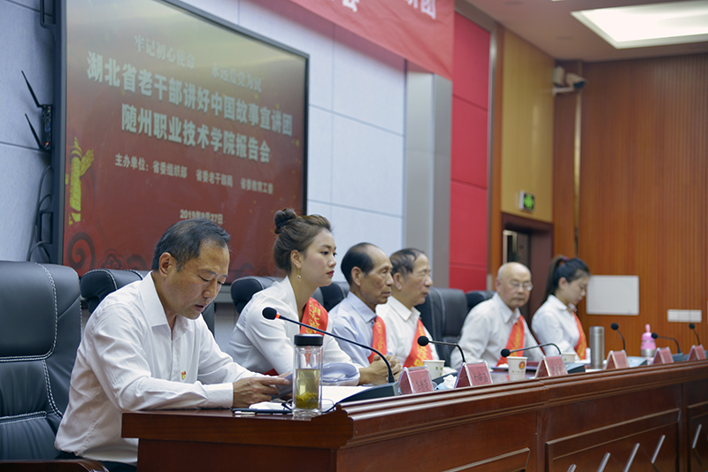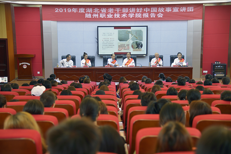 9月27日上午,在喜迎国庆70周年即将到来之际,由省委组织部、省委老干部局、省委教育工委组织的2019年湖北省老干部讲好中国故事宣讲团•Beat365唯一官方网站报告会在Beat365官网学术报告厅举行。武汉市武昌区原巡视员,全国优秀共产党员、全国道德模范、全国离退休干部先进个人吴天祥同志;全省离退休干部模范、荆门市农业局退休干部、“农技120”陈再明同志;恩施州来凤县融媒体中心记者,深藏功名、坚守初心的老英雄张富清同志先进事迹报告人向梓涵同志;省老年大学干部、我省毕生爱党为民、清正廉洁的老共产党员沈因洛同志先进事迹报告人张婷同志,现场分享了感人事迹,给师生上了一堂生动、深刻的思政课。省委老干部局相关部门负责人,Beat365官网全体校领导、全体中层干部、党员代表、思想政治教育工作者代表、离退休干部代表、师生代表等参加会议。会议由学院党委书记李德荣主持。