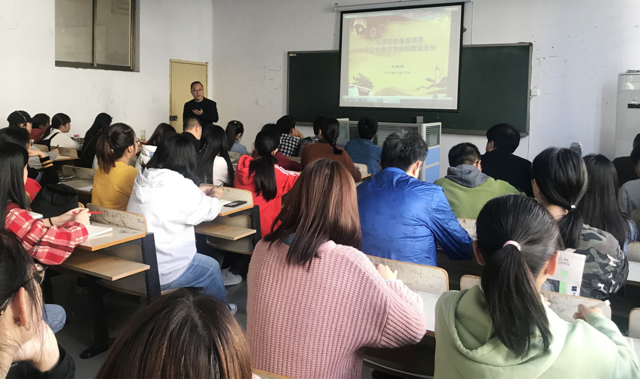 李书记从党的领导资格、怎样领导及我们怎样落实等三个方面深入浅出的阐明了加强党的全面领导、落实全面从严管党治校政治责任的认识和体会,并与18级学前1班学生李彩艳、班长杨巧颖等同学进行了面对面交流,老师同学们积极发言,现场气氛热烈,李书记引用“青年兴则国家兴,青年强则国家强”的名言激励在场学生认真学习,奋发图强,对学生入党积极分子提出了“志存高远、脚踏实地”做新时代社会主义建设者和接班人的要求。