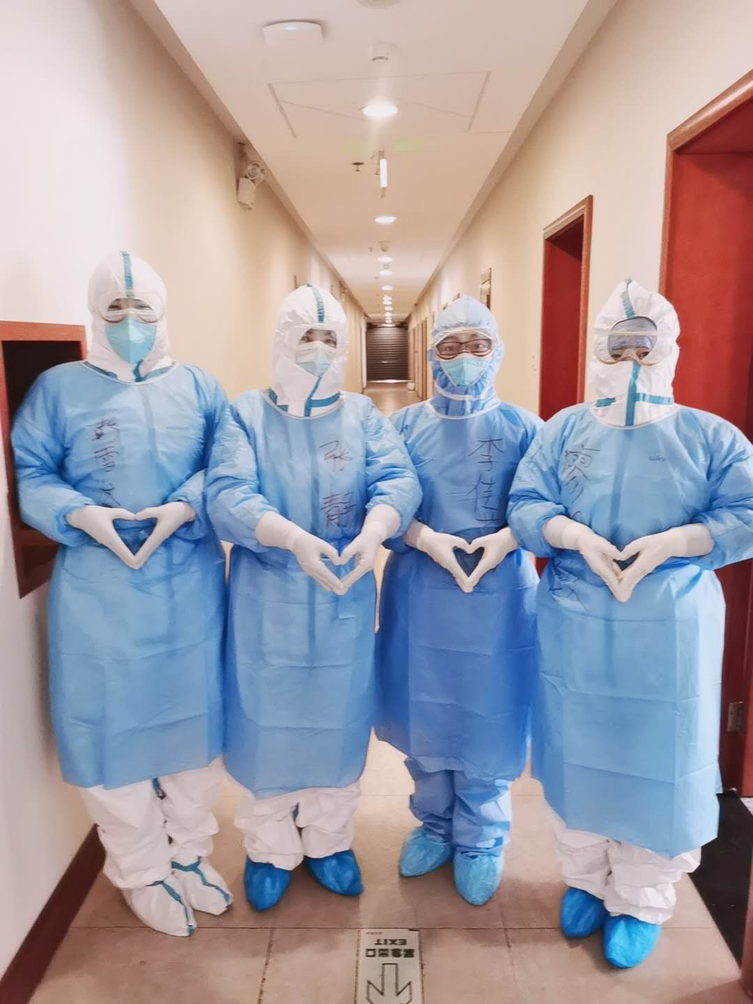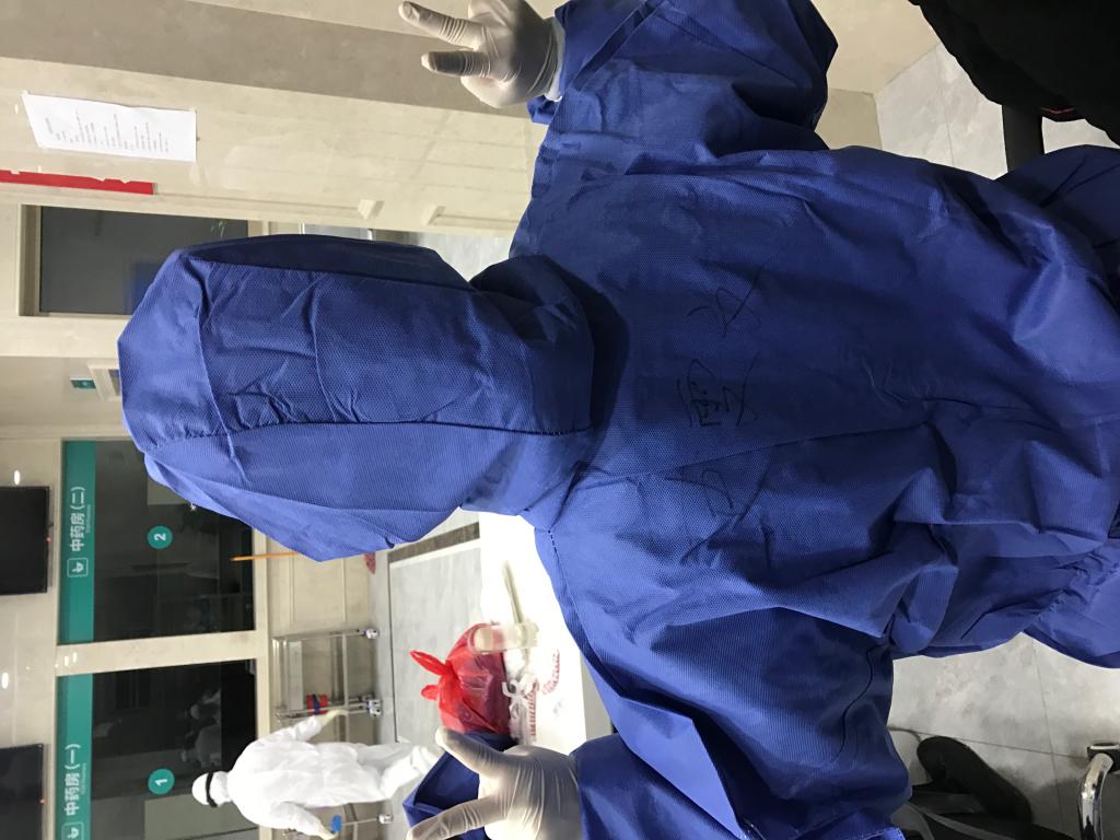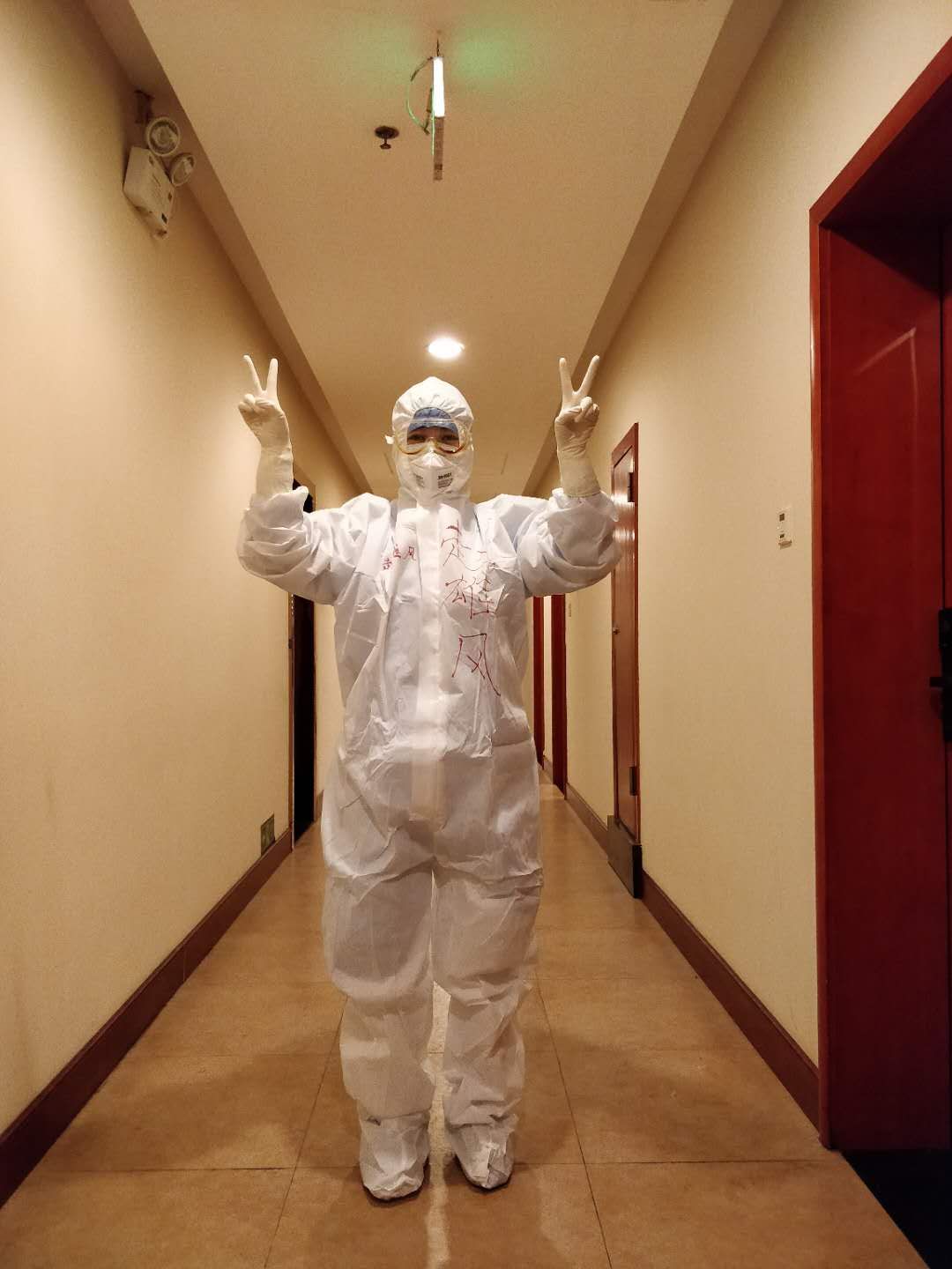 同事在史雯文防护服背后写上她的名字