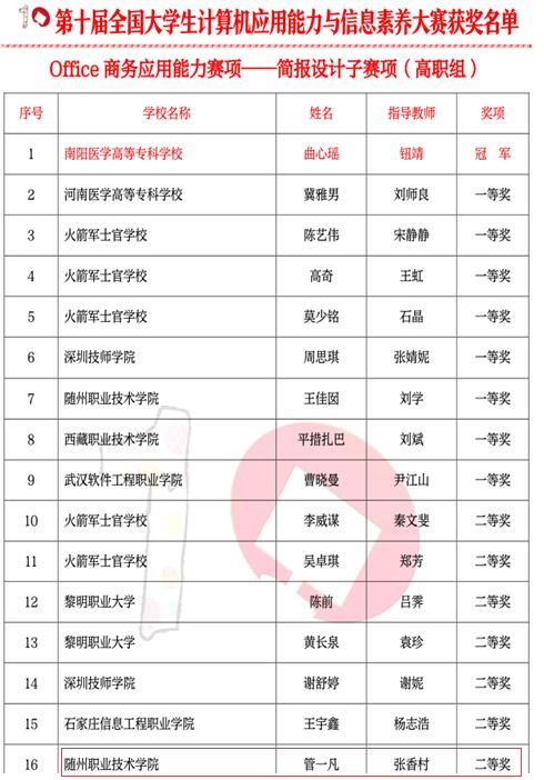 在刚刚结束的第十届全国大学生计算机应用能力与信息素养大赛(暨海峡两岸产业核心技能素养大赛)中,我院学子取得骄人成绩,共获得获1个一等奖,5个二等奖、10个三等奖,我院获得团体全国三等奖和特殊贡献奖学校荣誉。本届大赛共有90多个本专科院校代表队,近8000名同学参加大赛的七个单项预赛,最后进入总决赛的院校代表队有87个,参赛选手数为680人。通过层层筛选和激烈角逐,我院学前教育专业的王佳囡同学获得Office商务应用能力赛项——简报设计赛项的全国总决赛一等奖;许豪杰、管一凡、李彩艳、王瑜琪等同学获得全国二等奖。