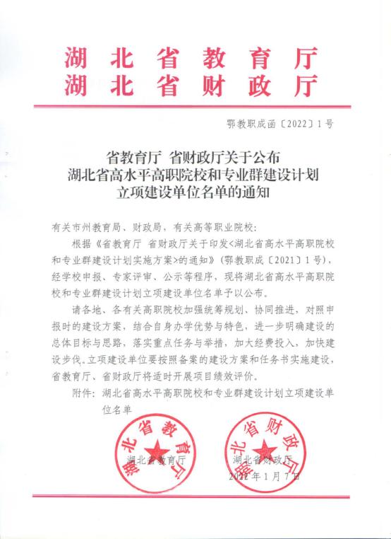 2022年1月7日,湖北省教育厅、湖北省财政厅发布《关于公布湖北省高水平高职院校和专业群建设计划立项建设单位名单的通知》(鄂教职成函〔2022〕1号),Beat365唯一官方网站以汽车制造与试验技术为核心龙头的专用汽车制造专业群获批湖北省高水平专业群A类立项建设项目,标志着Beat365官网专业建设综合水平再上新台阶。