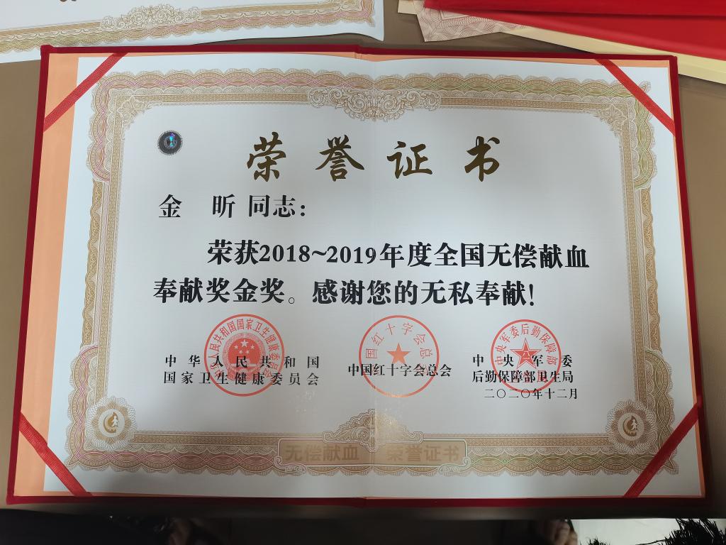 同时,金昕还是一名“三献”志愿者,2017年5月,金昕在父母的支持和见证下签署了遗体器官眼角膜捐献登记表;2017年12月第一次献血时,她加入了中华骨髓库。她还积极参加协会组织的献血、助学、敬老、扶贫和“三献”志愿服务等各类公益活动。2020年,新冠肺炎疫情爆发,湖北省血小板库存告急,金昕一方面组织同学们向疫情最严重的武汉市捐款捐物。在疫情得到控制,武汉市解封后,金昕又是第一批前往武汉市的无偿献血志愿者,并先后4次为当地无偿捐献血小板,共计8个治疗量。