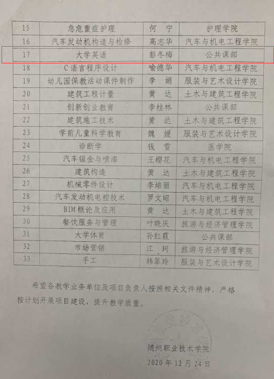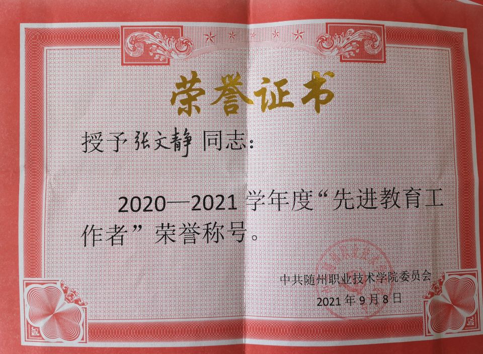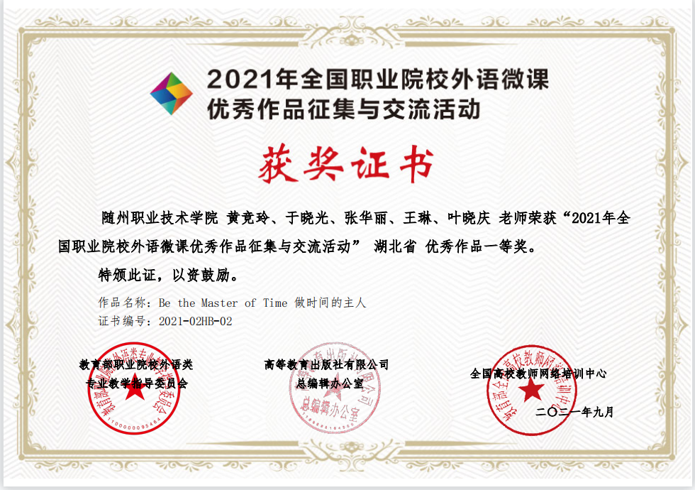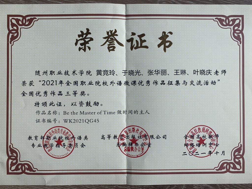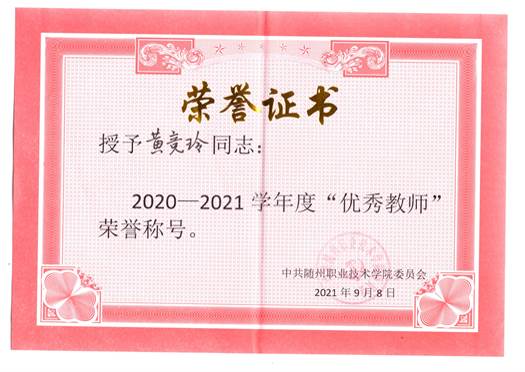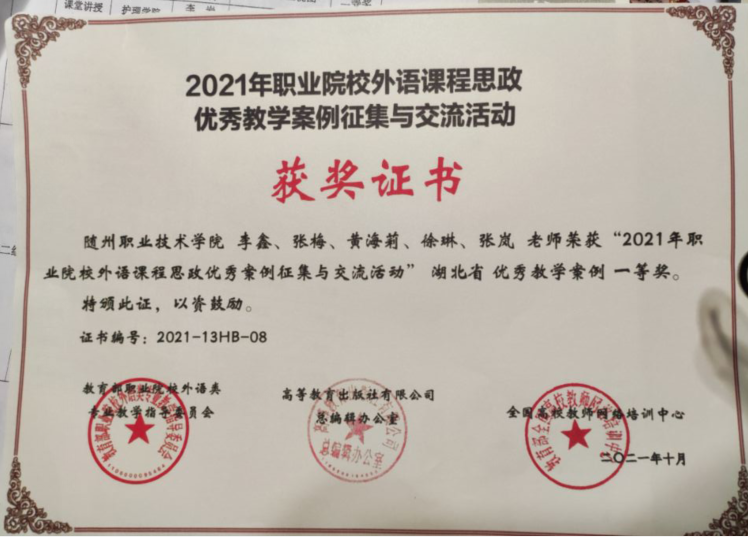 公共课部方立文、李世平曾获湖北省“优秀教师”;李世平、黄政华、蒋绍南曾获随州市“优秀教师”;叶鑫曾获湖北省首届“荆楚好老师”、湖北省“师德先进个人”、随州市“青年岗位能手”、湖北省教学能力大赛二等奖;方立文曾获“随州市师德标兵”;蒋建华曾获中国高等教育学会职业技术教育分会征文三等奖、第八届随州市自然科学优秀学术论文三等奖、第九届随州市自然科学优秀学术论文二等奖;李娥曾获得“湖北省女职工练功立业标兵”、湖北省第一届高职教师基本功技能大赛中年组二等奖、湖北省“三八红旗手”;徐明曾多次获湖北省“优秀教练员”、湖北省学校体育活动“先进个人”;张岚曾获湖北省职业院校信息化大赛(高职组)“信息化课堂教学”赛项二等奖、随州市第九届自然科学优秀论文三等奖;张梅、徐琳、张岚、孙红霞、张文静曾多次在学校信息化比赛获奖;综合教研室教师指导学生参加大学生“互联网+”创新创业大赛获校级银奖2项,省级铜奖3项;英语教研室教师团队在首届全国高等学校外语课程思政教学比赛获全国一等奖;在全国职业院校外语微课优秀作品征集与交流活动中获湖北省优秀作品一等奖两项。