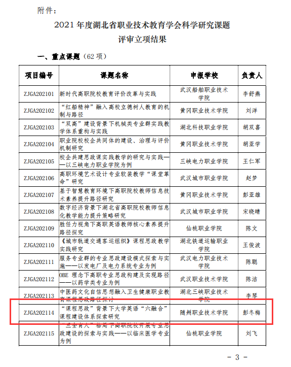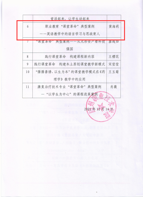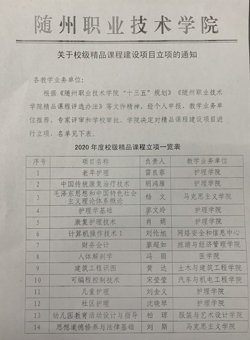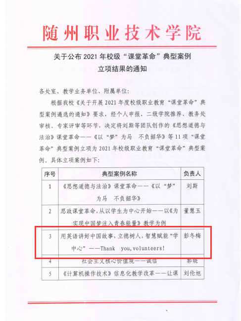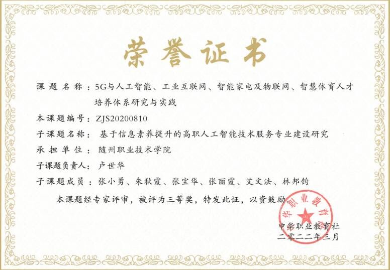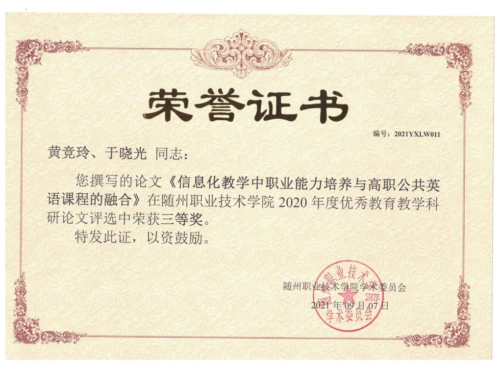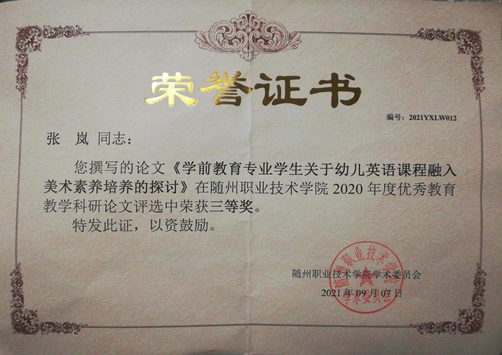 公共课部方立文、李世平曾获湖北省“优秀教师”;李世平、黄政华、蒋绍南曾获随州市“优秀教师”;叶鑫曾获湖北省首届“荆楚好老师”、湖北省“师德先进个人”、随州市“青年岗位能手”、湖北省教学能力大赛二等奖;方立文曾获“随州市师德标兵”;蒋建华曾获中国高等教育学会职业技术教育分会征文三等奖、第八届随州市自然科学优秀学术论文三等奖、第九届随州市自然科学优秀学术论文二等奖;李娥曾获得“湖北省女职工练功立业标兵”、湖北省第一届高职教师基本功技能大赛中年组二等奖、湖北省“三八红旗手”;徐明曾多次获湖北省“优秀教练员”、湖北省学校体育活动“先进个人”;张岚曾获湖北省职业院校信息化大赛(高职组)“信息化课堂教学”赛项二等奖、随州市第九届自然科学优秀论文三等奖;张梅、徐琳、张岚、孙红霞、张文静曾多次在学校信息化比赛获奖;综合教研室教师指导学生参加大学生“互联网+”创新创业大赛获校级银奖2项,省级铜奖3项;英语教研室教师团队在首届全国高等学校外语课程思政教学比赛获全国一等奖;在全国职业院校外语微课优秀作品征集与交流活动中获湖北省优秀作品一等奖两项。