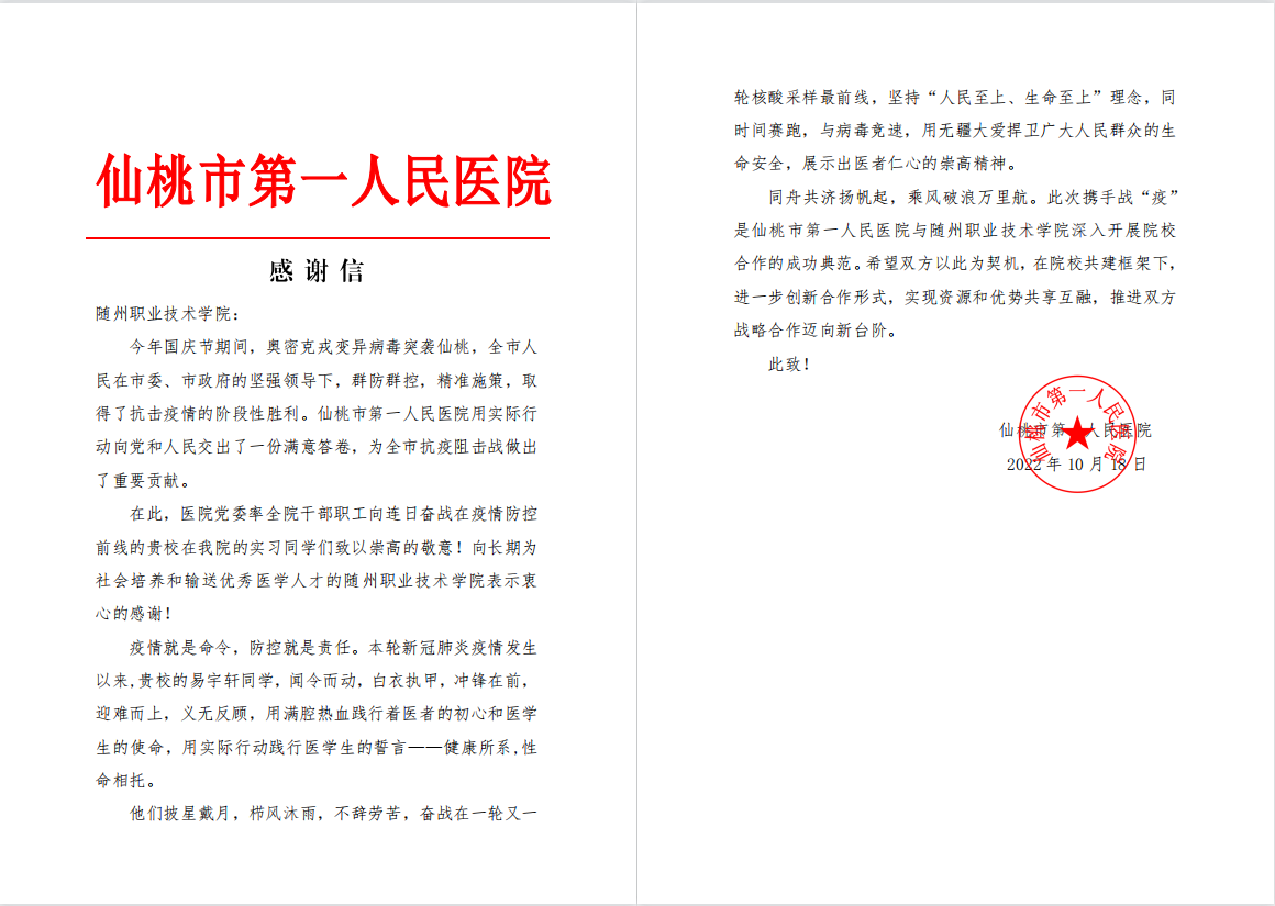 近日,Beat365官网收到仙桃市第一人民医院的一封感谢信,信中对奋战在疫情防控前线的Beat365官网医学院2020级临床1班的易宇轩同学表达了感谢,同时向长期为社会培养和输送优秀医学人才的Beat365唯一官方网站表示衷心的感谢!