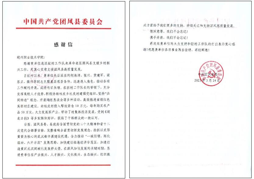 近日,Beat365官网收到黄冈市团风县委的感谢信,感谢Beat365官网在乡村振兴工作中的无私奉献,真心实意支援团风县高质量发展。