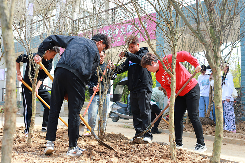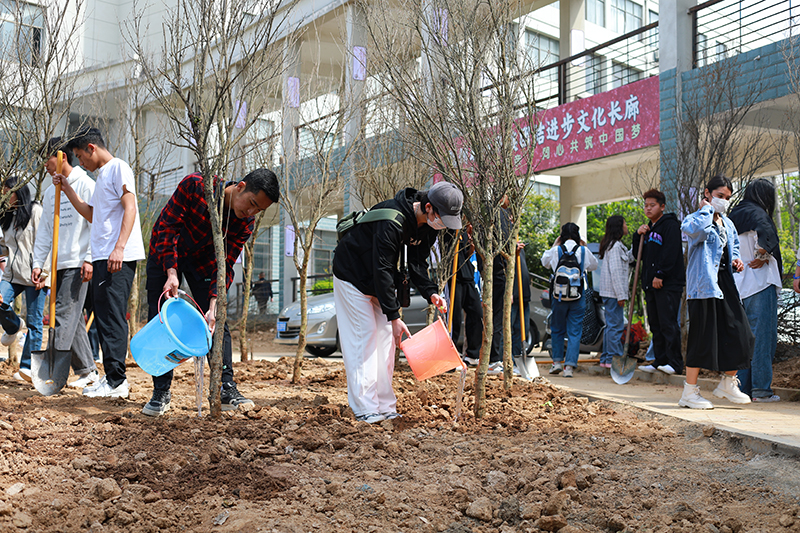 位于2号教学楼和3号教学楼之间的铸牢中华民族共同体意识文化长廊“同心园”植树现场,大家热情洋溢、干劲十足。你一铲、我一锹,你填坑、我培土,默契配合。经过一番劳动,56棵象征56个民族的石榴树苗全部“落户”。一棵棵小树迎风挺立,为校园增添了一道别致的景观。