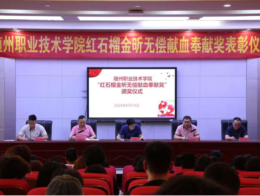 6月14日,第一届“红石榴·金昕无偿献血奉献奖”颁奖仪式在Beat365官网学术报告厅举行。学校党委委员、副校长邹厚亏,市中心血站副站长吴大奎,学生工作处处长钟守兵,护理学院院长何宁,团委社团管理科科长陈赛,以及各二级学院党总支副书记、学工办主任、团总支书记,受表彰的学生及无课师生代表参加了此次表彰活动。