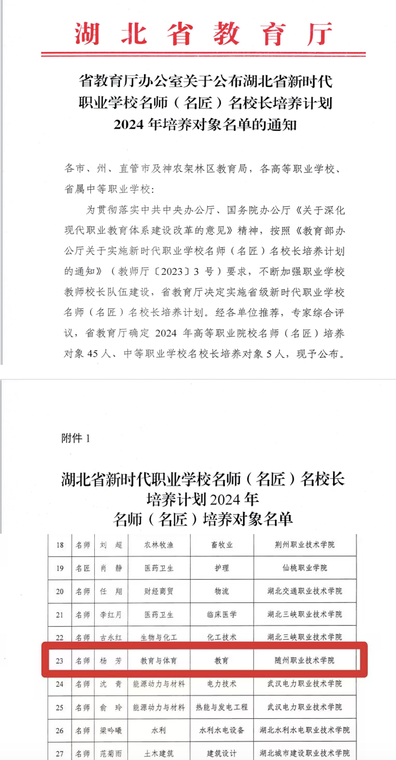 7月5日,省教育厅公布了湖北省新时代职业学校名师(名匠)名校长培养计划2024年培养对象名单,Beat365官网教师杨芳入选教育类名师培养对象。