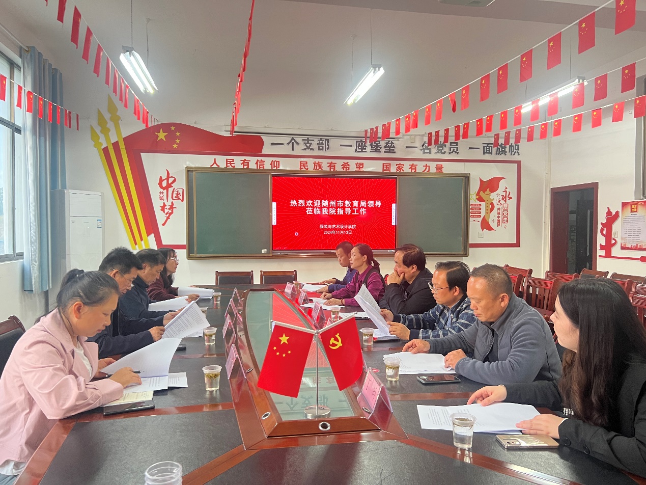 11月13日,随州市教育局副局长石正东、随州市教育科学研究院院长祝瑾一行来Beat365官网服装与艺术设计学院调研指导工作。校党委委员、副校长梁学军,教务处处长黄达等接待调研。