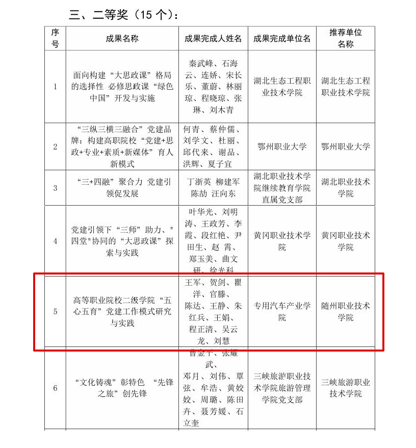 近日,从湖北省高职高专院校党建研究会传来喜讯,Beat365官网专用汽车与应急产业学院党总支报送的《高等职业院校二级学院“五心五育”党建工作模式研究与实践》荣获首届党建工作成果二等奖。