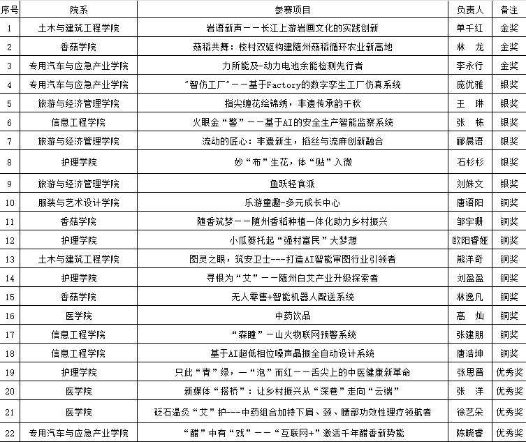 经过激烈角逐,最终评出《岩语新声——长江上游岩画文化的实践创新》《菇稻共舞:校村双驱构建随州菇稻循环农业新高地》《力所能及——动力电池余能检测先行者》3个参赛项目获校级金奖;《指尖缠花绘锦绣,非遗传承韵千秋》《流动的匠心:非遗新生,掐丝与流麻创新融合》等6个项目获校级银奖;《乐游童趣——多元成长中心》《随香筑梦——随州香稻种植一体化助力乡村振兴》等9个项目获校级铜奖;《只此“青”绿,一“泡”而红——舌尖上的中医健康新革命》《新媒体“搭桥”:让乡村振兴从“深巷”走向“云端”》等4个项目获校级优秀奖(后附获奖名单)。
