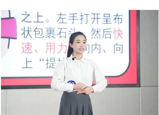 本次大赛中,葛尧以《救命只需要一个拥抱:海姆立克的生死时速》为题,巧妙地将扎实的护理专业知识融入生动的应急场景。她通过逼真的情景模拟还原急救现场,以精准的操作示范、通俗易懂的语言进行科普,配合与现场观众的有效互动,清晰、高效地传递了急救核心要点。其流畅的表达、专业的素养和沉稳的台风,赢得了评委与观众的高度认可,最终成功跻身全省十佳。
