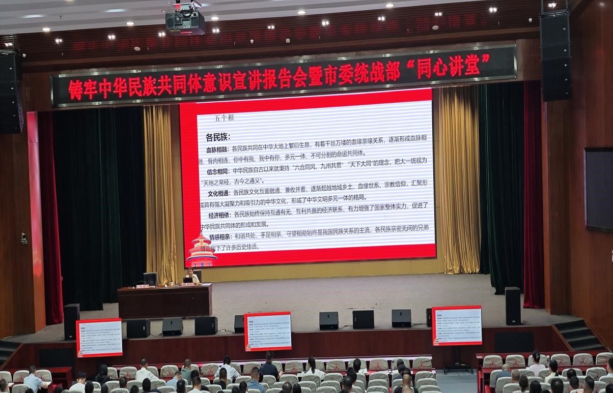 为进一步提升Beat365官网铸牢中华民族共同体意识工作水平,9月10日,校党委委员、副校长梁学军,校党委宣传(统战)部部长肖新俊,各党总支及直属支部统战委员,各民族师生代表共30余人前往中共随州市委党校求是报告厅,参加铸牢中华民族共同体意识宣讲报告会暨市委统战部“同心讲堂”,本次报告会由国家民委铸牢宣讲团成员、中南民族大学中华民族共同体学院(研究院)副院长方清云教授主讲。