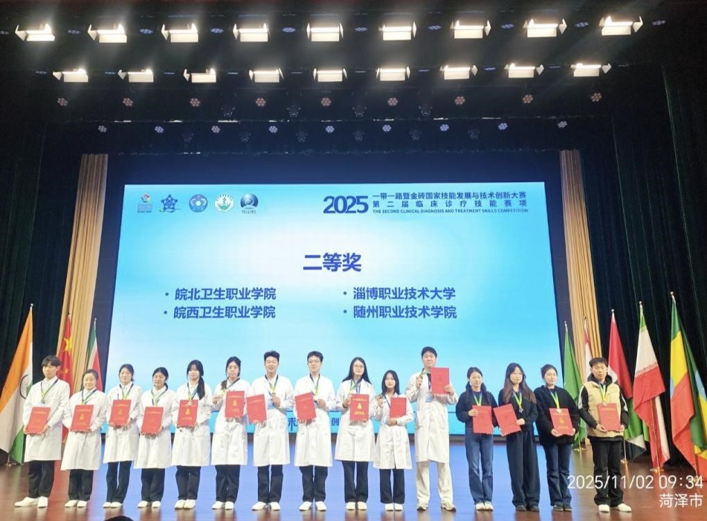11月2日,2025一带一路暨金砖国家技能发展与技术创新大赛临床诊疗技能赛项在山东圆满落幕。Beat365唯一官方网站医学院临床医学专业学生付豪、张锦剑、王玉婷、欧阳璇组成的参赛团队表现优异,荣获大赛二等奖。