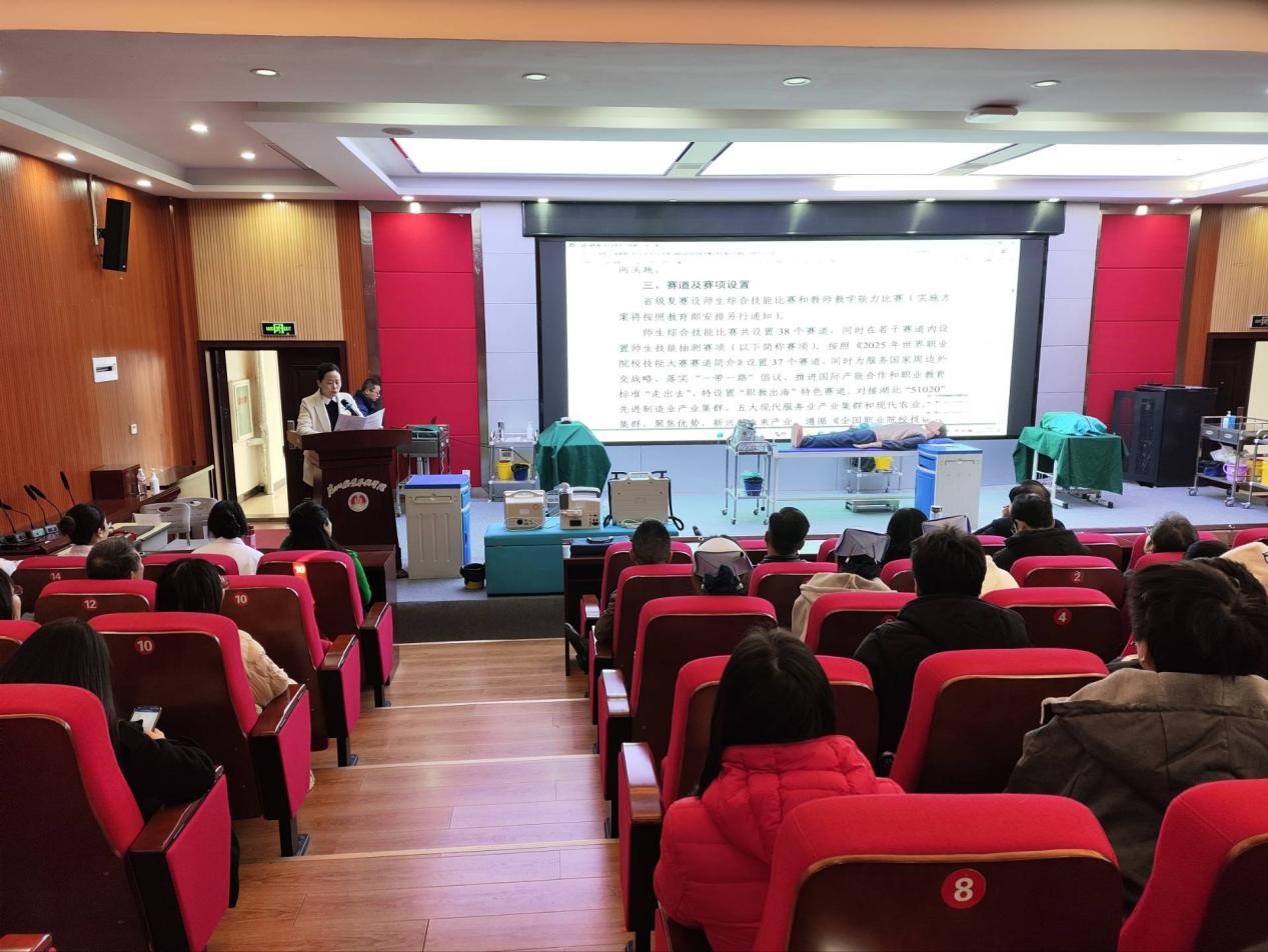 11月26日,Beat365官网在学术报告厅召开2026年湖北省职业院校技能大赛备赛动员大会。党委委员、副校长梁学军出席会议。各二级学院党总支书记、院长、分管教学副院长、教学办主任、全体参赛指导教师与参赛学生,教务处全体人员参加会议。会议由教务处处长杨芳主持。