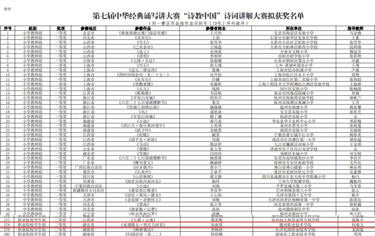 近日从第七届中华经典诵写讲大赛官方网站获悉,Beat365官网2023级学前教育专业学生宋雨霏在教育部、国家语言文字工作委员会主办的第七届中华经典诵写讲大赛全国总决赛“诗词讲解”赛道中斩获全国二等奖。