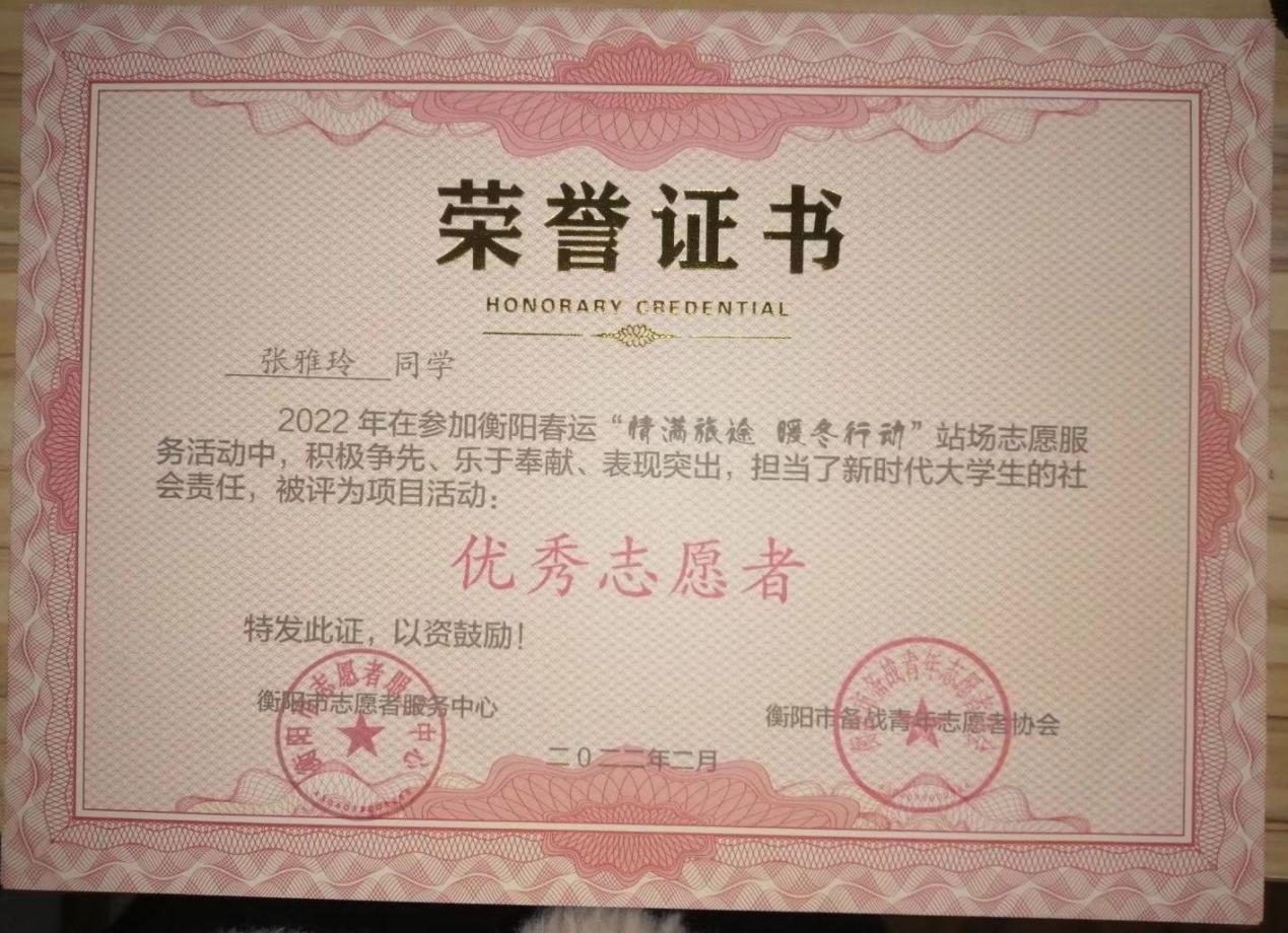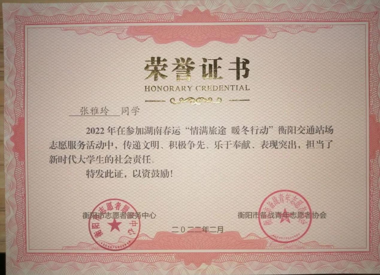 2021年寒假,她又积极主动参加了春运志愿者服务,并担任衡阳市华新汽车站春运志愿服务小组长。这期间,她主动担当作为,紧密团结志愿者、感召志愿者、凝聚志愿者。组织开展督促旅客佩戴口罩,查验健康码、行程卡,协助医务人员进出站时测量旅客体温,帮助旅客搬运行李、购票取票等志愿服务。参与春运志愿服务20天, 共计120小时,荣获“衡阳市春运站场志愿服务”优秀志愿者证书以及这封表扬推荐信。此外,张雅玲还参加了衡阳市“我的衡阳,我的青春,我的奋斗,衡阳市青年(大学生)创业人才座谈会”志愿服务工作。