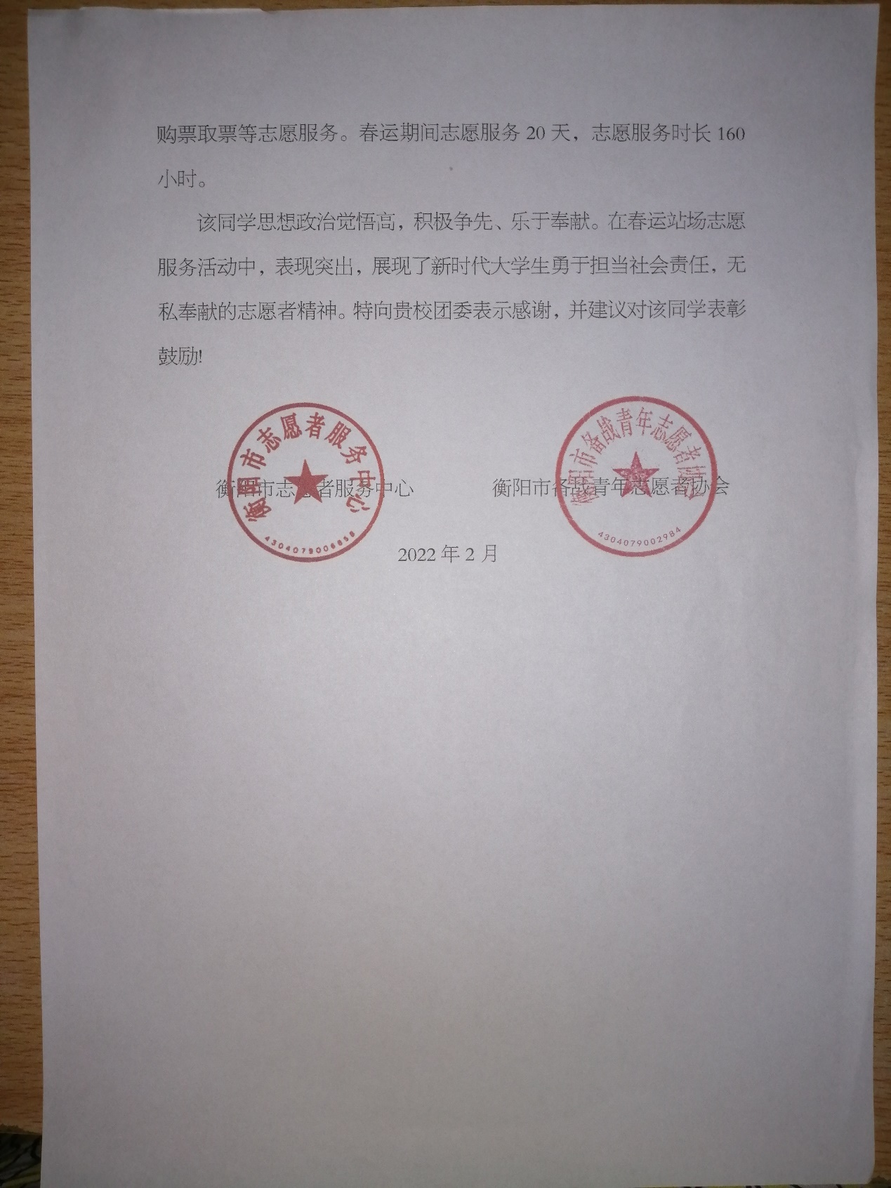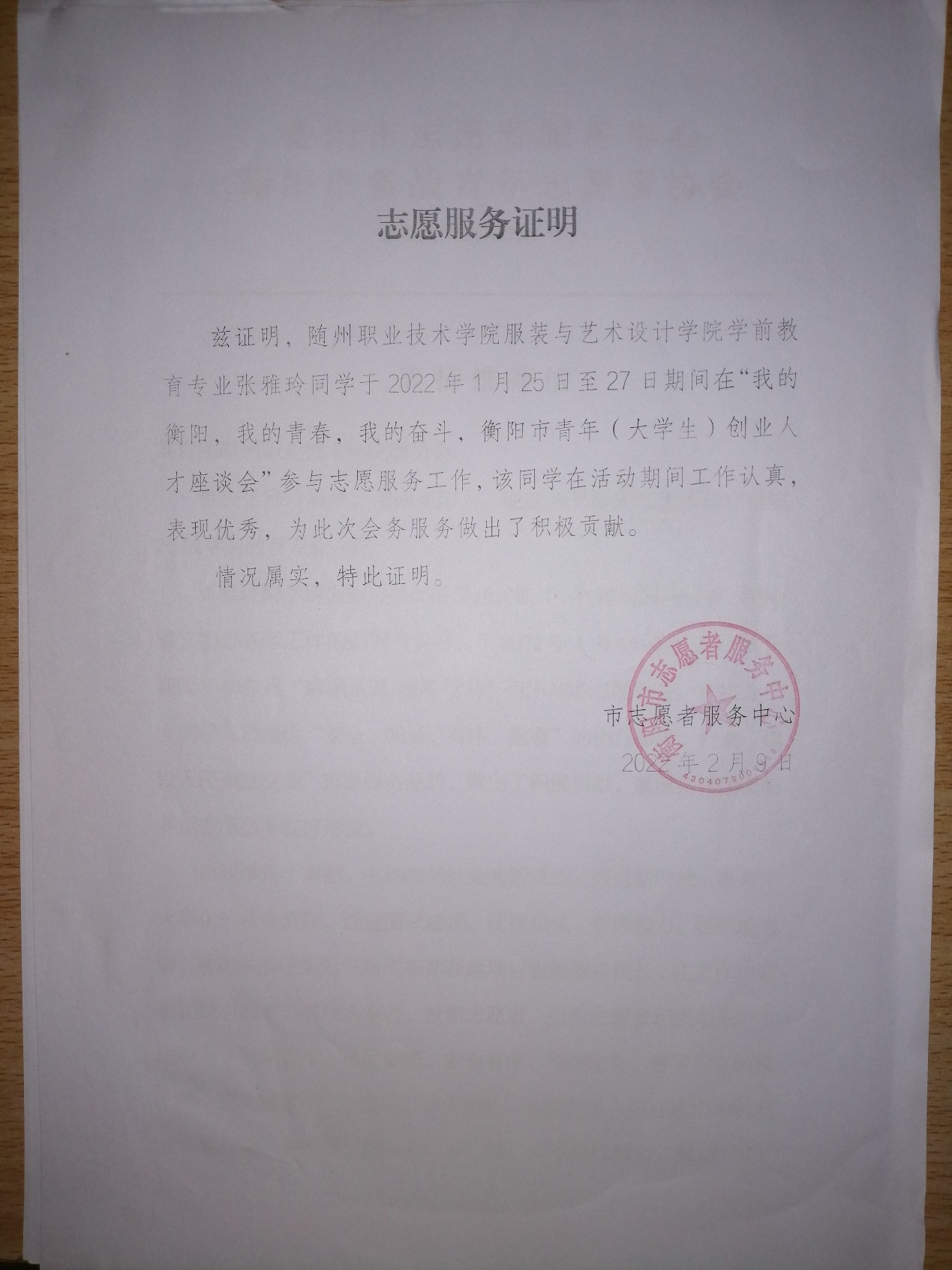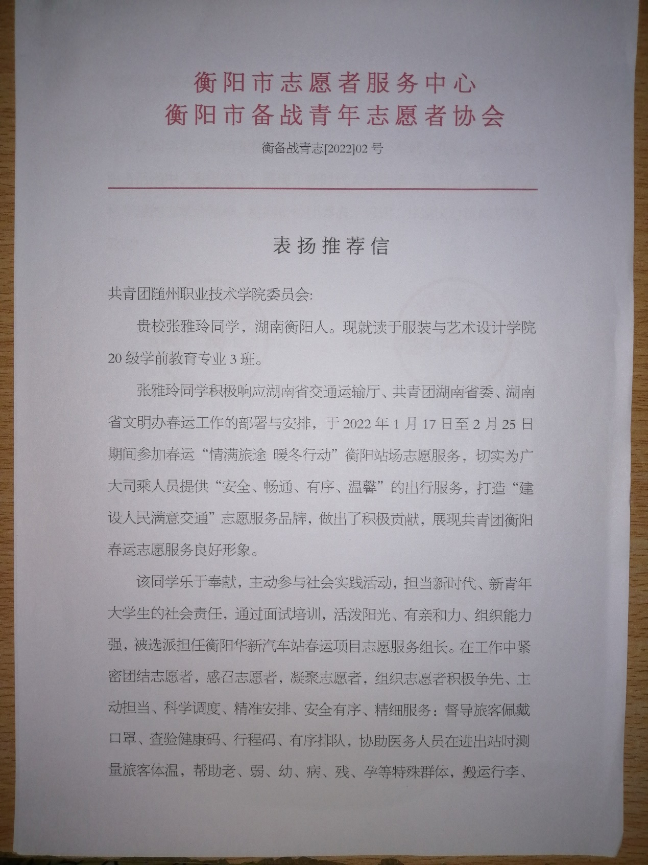 2月下旬,Beat365官网团委收到一封由衡阳市志愿服务中心、衡阳市备战青年志愿者协会所颁发的表扬推荐信。表扬服装与艺术设计学院学前教育专业2020级2班学生张雅玲积极响应地方政府号召,主动加入到衡阳市疫情防控志愿者队伍的先进事迹。