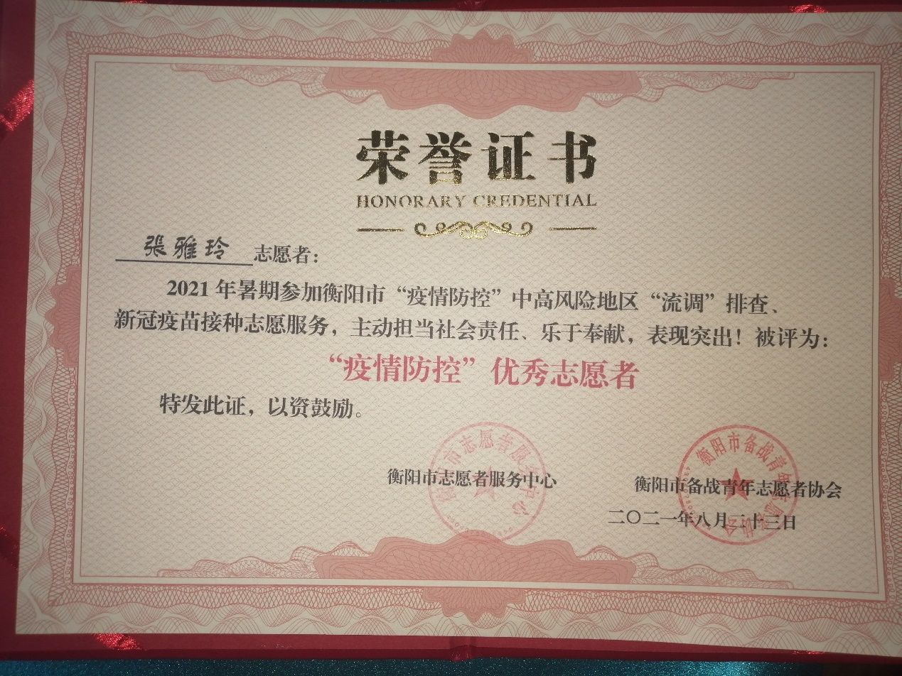 2021年暑假,在疫情期间,张雅玲积极参与了当地人员流动信息排查、高速公路口昼夜值守、有关疫情防控的工作座谈会和志愿者学习交流会,获得2021年“疫情防控”优秀志愿者证书。