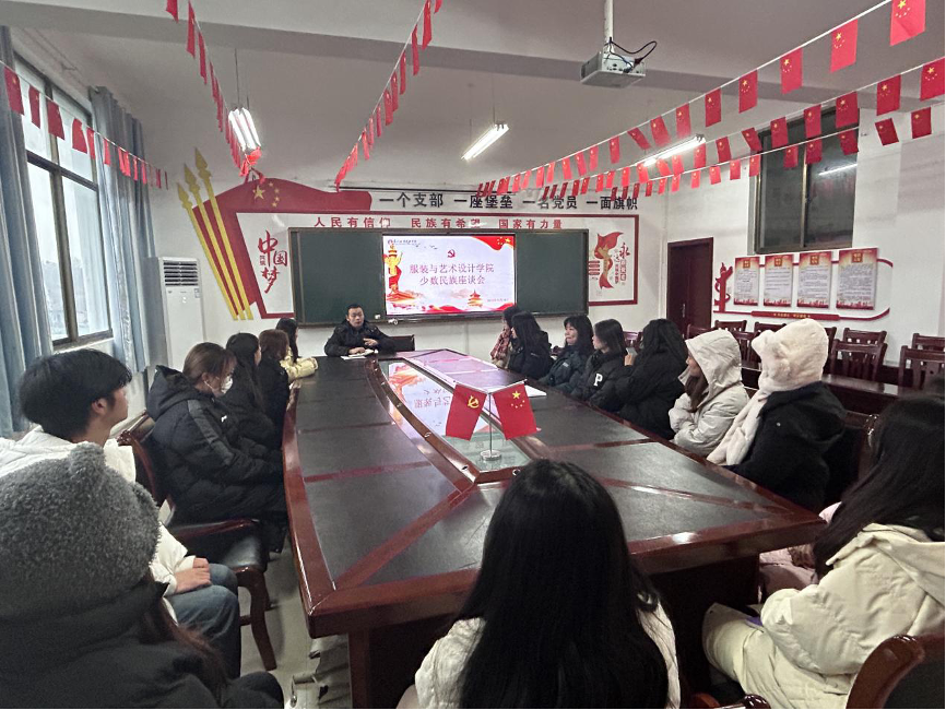 为深入学习贯彻党的二十大精神,深化民族团结进步宣传教育工作,了解各民族学生的生活状况,促进民族团结进步,有形有感有效地铸牢中华民族共同体意识,助力学生成长成才与全面发展,12月14日下午,服装与艺术设计学院在1416召开以“同心共话民族情,凝心聚力齐奋进”为主题的各民族学生座谈会。服装与艺术设计学院党总支副书记张亦飞、专职辅导员庞樊随以及各民族学生代表参会。