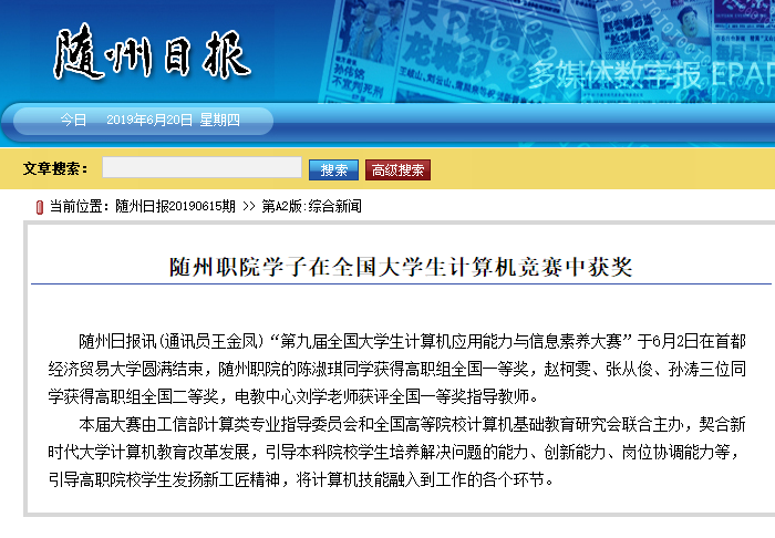 上一条:随州日报:随州职院学子在全国大学生计算机竞赛中获奖